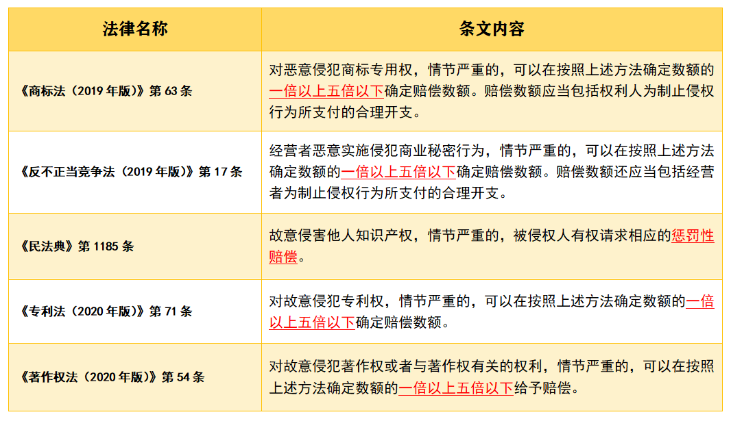新《著作權(quán)法》規(guī)定,“對(duì)故意侵犯著作權(quán)或者與著作權(quán)有關(guān)的權(quán)利,情節(jié)嚴(yán)重的,可以在按照上述方法確定數(shù)額的一倍以上五倍以下給予賠償。”這一規(guī)定與《民法典》第1185條規(guī)定的知識(shí)產(chǎn)權(quán)懲罰性賠償一脈相承,與《商標(biāo)法》第63條、《專利法》第71條、《反不正當(dāng)競(jìng)爭(zhēng)法》第17條基本一致。《著作權(quán)法》中增加懲罰性賠償制度,意味著在知識(shí)產(chǎn)權(quán)領(lǐng)域懲罰性賠償制度已經(jīng)較為全面的建立(見(jiàn)下圖)。