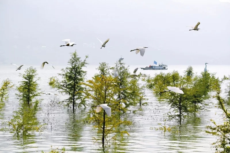 人民法院認真貫徹落實習近平生態(tài)文明思想,努力為生態(tài)文明建設(shè)與綠色發(fā)展提供優(yōu)質(zhì)司法服務(wù)。在長江三峽庫區(qū),為解決庫區(qū)消落帶植物存活的治理難題,重慶法院引進了耐淹耐旱的中山杉。圖為重慶法院長江三峽庫區(qū)生態(tài)修復司法保護示范林的中山杉在水庫蓄水時被部分淹沒的景象。最高人民法院供圖