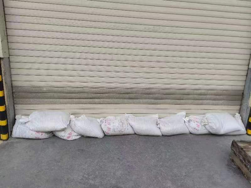 (圖為泉州鹽業配送中心倉庫準備應急防汛沙袋,對倉庫卷閘門進行防水防堵。)