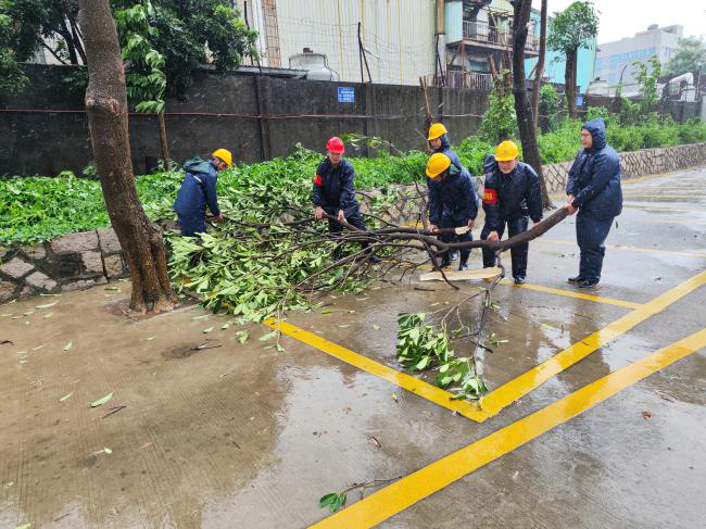 (圖為泉州融合黨員突擊隊排查風險隱患,及時清理倒塌的樹枝)