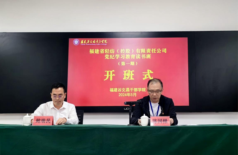 為深入學習貫徹習近平總書記關于黨紀學習教育的重要講話和重要指示精神,教育引導黨員干部學紀、知紀、明紀、守紀,推動福建輕紡系統黨紀學習教育走深走實,5月13日,福建輕紡黨紀學習教育讀書班(第一期)在谷文昌干部學院正式開班。公司領導及司管干部共41人參加學習。公司黨委委員、副總經理陳國樑主持開班式并作動員講話。福建谷文昌干部學院副院長鮑瑞民出席開班式并致辭。