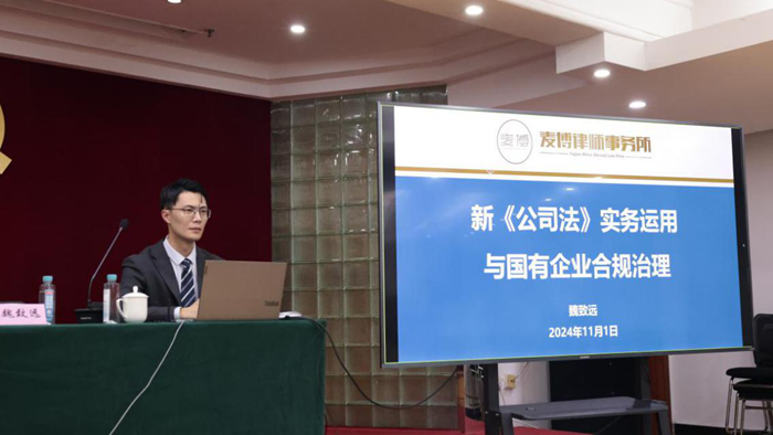 為深入學習貫徹習近平法治思想,落實全面依法治國戰略部署,2024年11月1日,福建輕紡開展2024年度依法治企培訓班,邀請福建麥博律師事務所合伙人魏致遠律師開展《新<公司法>實務運用與國有企業合規治理》主題培訓。