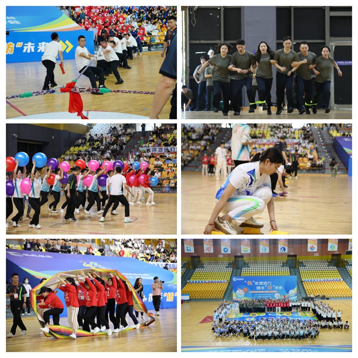 在隨后進行的趣味運動賽中,各支隊伍盡展所能,賽出屬于輕紡人的青春風采。激烈的“力拔山河”多向拔河比賽,各隊隊員緊握繩索,腳跟扎地,在齊聲吶喊中爆發(fā)出驚人的力量,場面緊張而激烈;歡快的“齊頭并進”項目中,參賽選手綁腿搭肩同行,口中喊著整齊的口號,步伐協(xié)調(diào)地向著終點沖刺,如同親密無間的戰(zhàn)友;巧妙的“凝心聚力”背夾球環(huán)節(jié)中,隊員們背靠背,心連心,夾著氣球快速又小心地前進,氣球的每一次微晃都牽動著全場觀眾的心;充滿挑戰(zhàn)的“共度難關(guān)”接力賽中,參賽隊伍爭分奪秒、心心相連、共度難關(guān),巨大的“車輪”憑借團隊協(xié)作的力量在賽道上飛速滾動,仿佛破浪前行的巨輪,朝著勝利的彼岸全速前進。趣味運動賽的最后,各參賽隊伍代表共同拼出匯聚著全體參賽企業(yè)圖形徽標的大拼圖并合影,象征著全體輕紡人團結(jié)一心、共同奮斗的堅定信念。經(jīng)過激烈而又充滿趣味的比拼,輕紡設(shè)計院最終獲得了趣味運動賽團體第一名,金皇環(huán)保和海峽融合分獲第二、第三名。