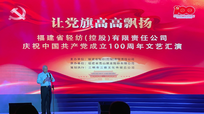6月18日,“讓黨旗高高飄揚——福建省輕紡(控股)有限責任公司慶祝中國共產黨成立100周年文藝匯演在福建省青山紙業股份有限公司順利舉行。省國資系統黨史學習教育第二巡回指導組組長黃建民、福建輕紡原黨組書記、董事長梁模、福建輕紡原黨組成員、副總經理黃國英等嘉賓及公司老領導出席了晚會。福建輕紡黨委書記、總經理黃文定出席晚會并致辭,輕紡領導班子成員、各權屬二級企業負責人和系統內干部職工代表觀看了文藝匯演。