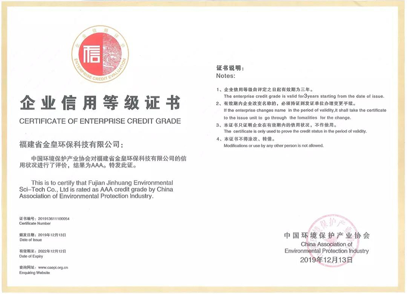 為促進環保產業誠信體系建設,提高環保企業誠信意識和信用水平,中國環境保護產業協會于2019年12月中旬評選出第十二批環保企業信用單位,金皇環保在本次評選中取得AAA信用評級。