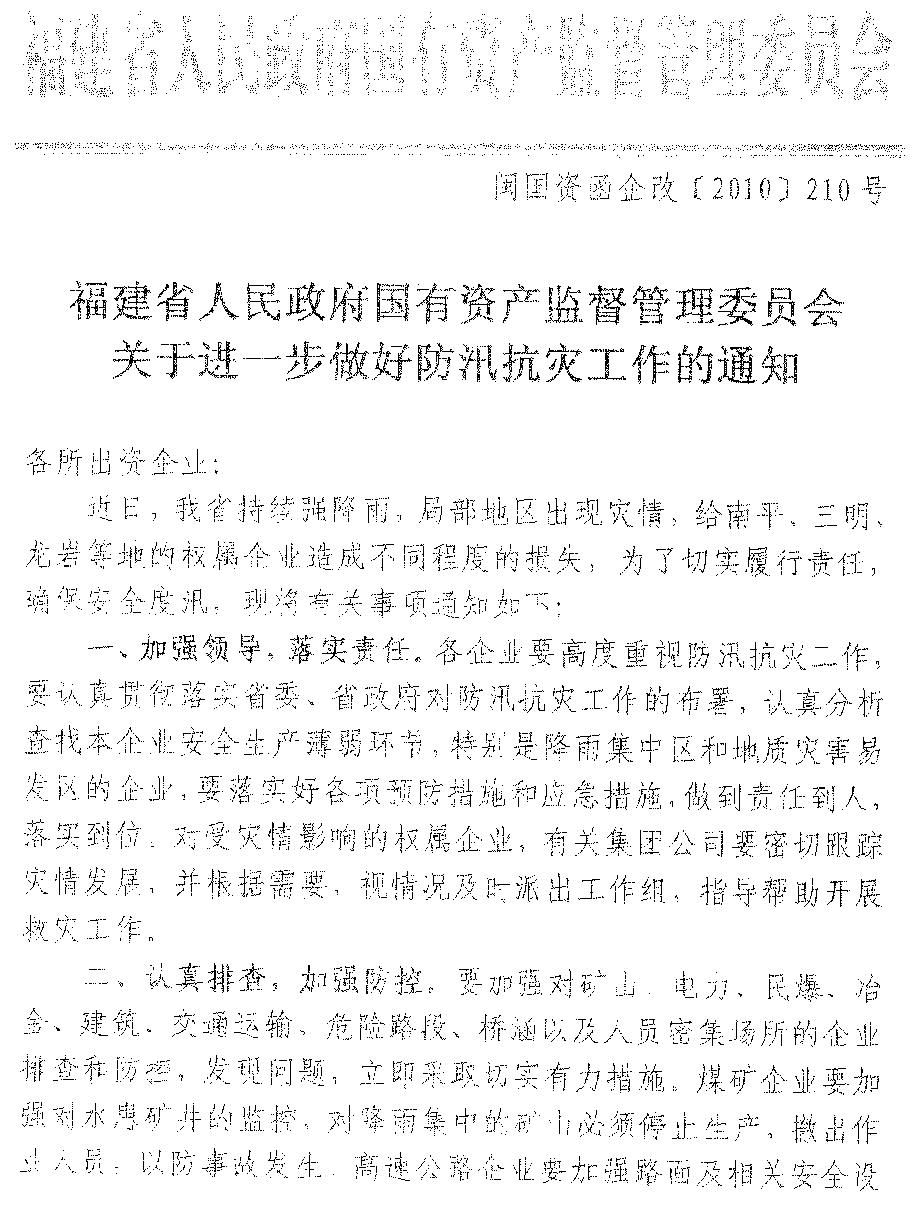 現將《福建省人民政府國有資產監督管理委員會關于進一步做好防汛抗災工作的通知》(閩國資函企改〔2010〕210號)轉發給你們。結合我司企業實際,提出如下要求,一并貫徹落實。