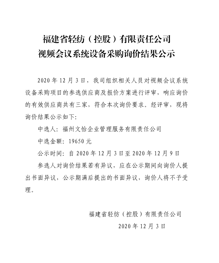 福建輕紡視頻會議系統設備采購詢價結果公示