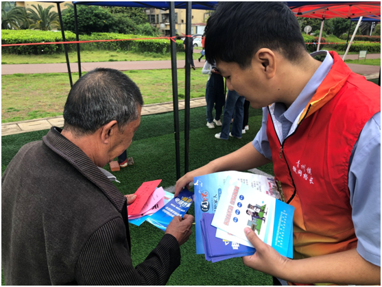 保衛處工作人員在發放反詐告知書、反詐宣傳單