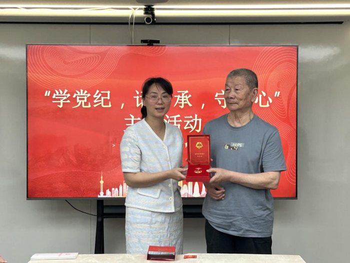 退休老黨員深情回顧了輕紡設計院篳路藍縷的發展歷程,講述了在公司工作期間的難忘故事,勉勵青年職工積極為公司發展貢獻青春力量。公司黨委委員、紀委書記林圩為退休老黨員鄭永棠頒發“光榮在黨50年”紀念章,鄭永棠同志對黨組織的關懷和激勵表示感謝,表示將繼續發揮老同志的傳承作用,關注和支持公司的發展。