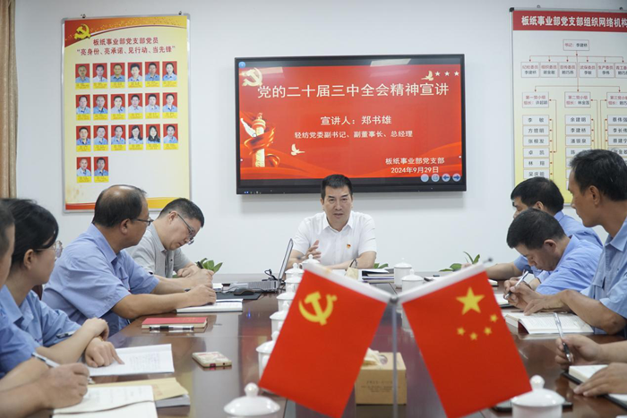 9月29日,福建輕紡黨委副書記、副董事長(zhǎng)、總經(jīng)理鄭書雄深入青山紙業(yè)板紙事業(yè)部黨支部,就黨的二十屆三中全會(huì)精神進(jìn)行了系統(tǒng)而深入的宣講。青山紙業(yè)黨委書記、董事長(zhǎng)林小河,黨委副書記、董事會(huì)秘書潘其星及板紙事業(yè)部全體黨員參加學(xué)習(xí)。